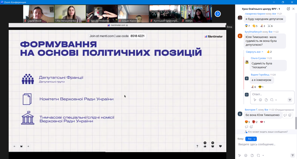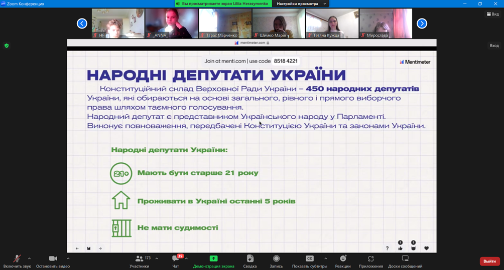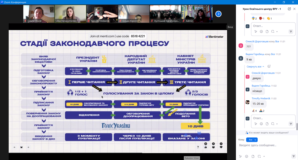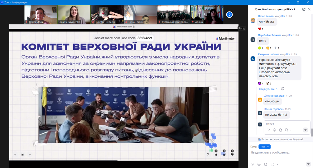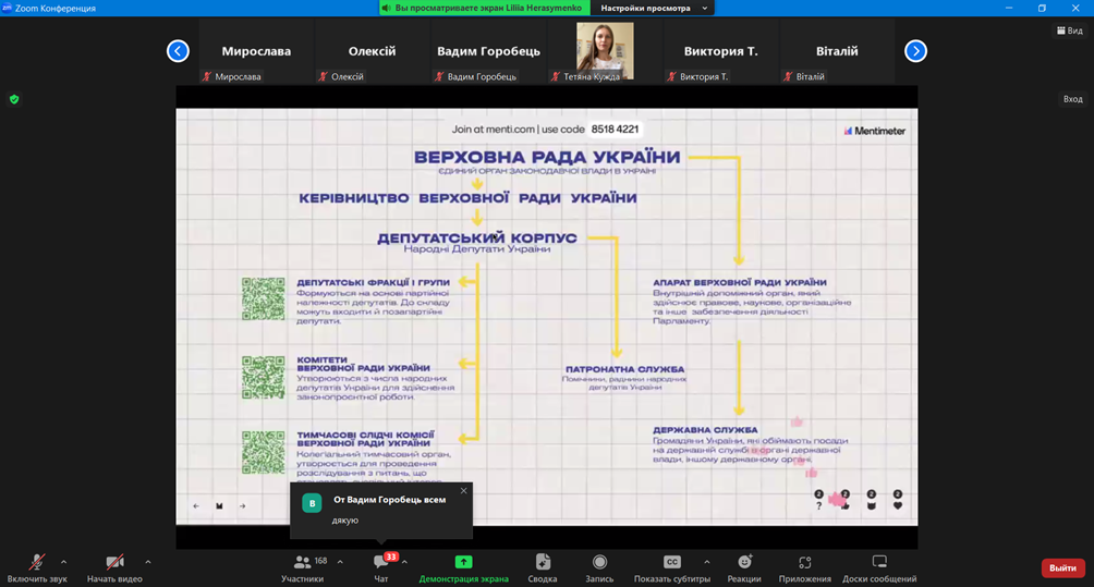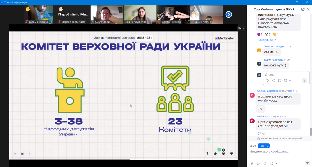На завершення он-лайн заняття для слухачів було проведено вікторину про діяльність Верховної Ради України. Слухачі продемонстрували свою уважність і зацікавленість темою уроку.