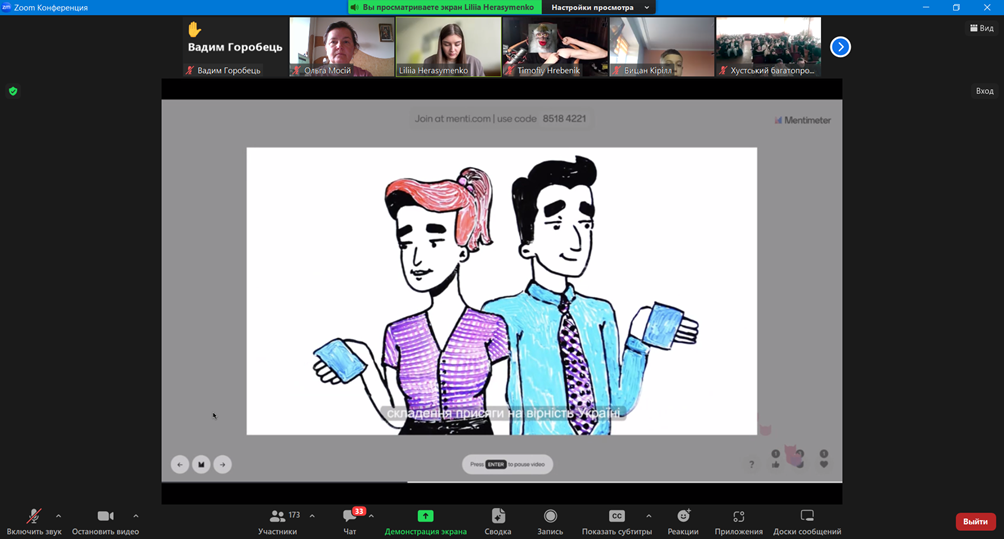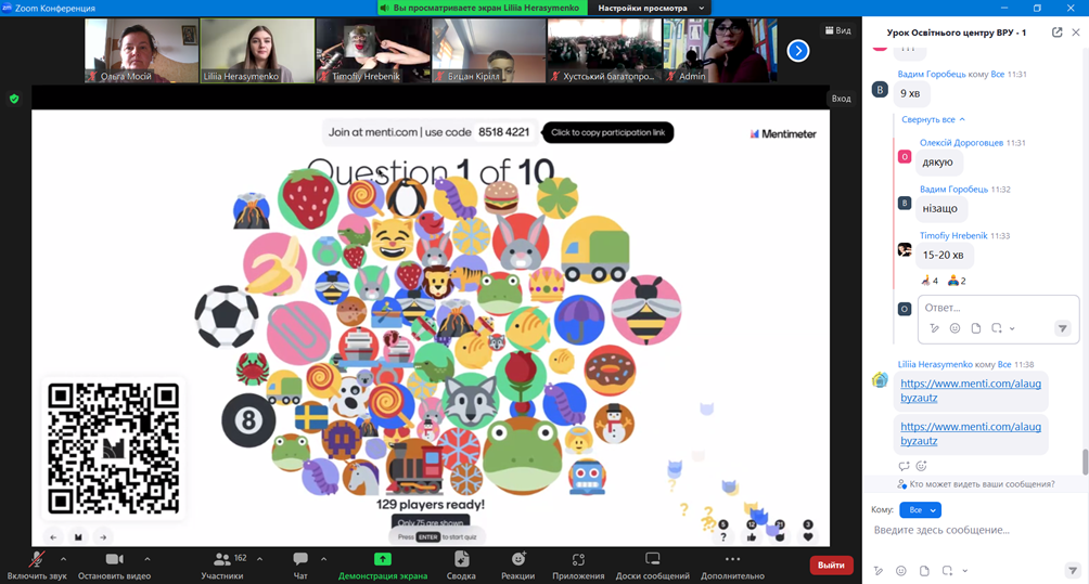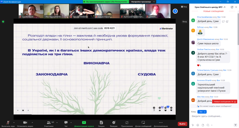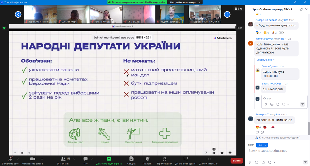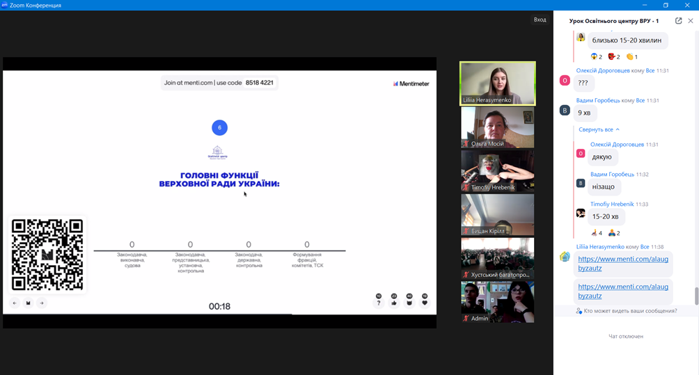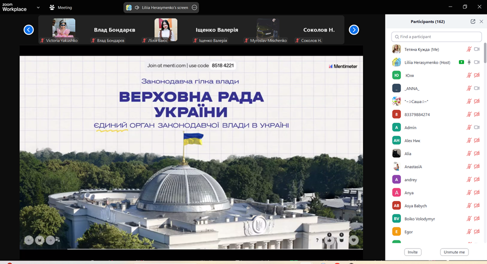 На завершення он-лайн заняття для слухачів було проведено вікторину про діяльність Верховної Ради України. Слухачі продемонстрували свою уважність і зацікавленість темою уроку.