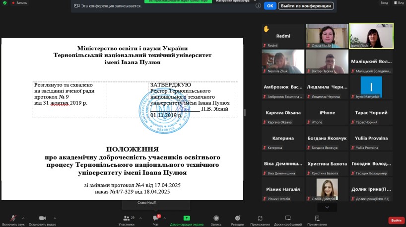 Викладачі ознайомили студентів із основними принципами та фундаментальними цінностями академічної доброчесності, основними формами проявів академічної недоброчесності, заходами щодо попередження проявів академічної недоброчесності, відповідальністю учасників університетської спільноти за порушення академічної доброчесності, відповіли на запитання студентів.